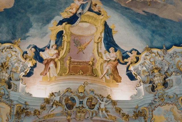העין נמשכת אל מרכז התקרה, שם מתרחשת לרוב הסצנה המרכזית. סביב לה – דמויות משניות, עננים, ואלמנטים אדריכליים מדומים שממשיכים את קווי הקירות כלפי מעלה.