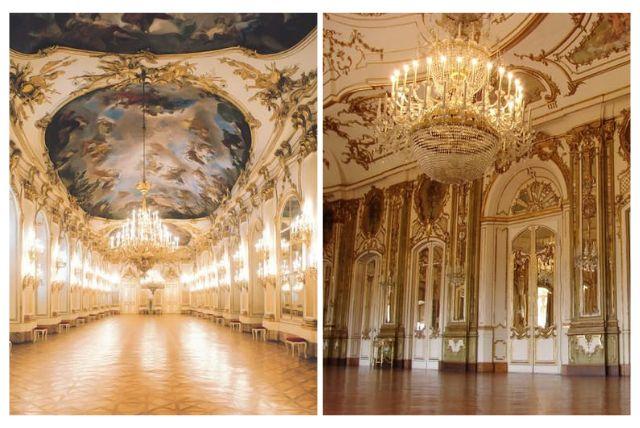 התקרה מעוטרת בציורי פרסקו מרהיבים המתארים סצנות מההיסטוריה של האימפריה. הקירות מצופים בעיטורים מוזהבים והמראות הגדולות יוצרות תחושה של חלל עצום ומפואר.