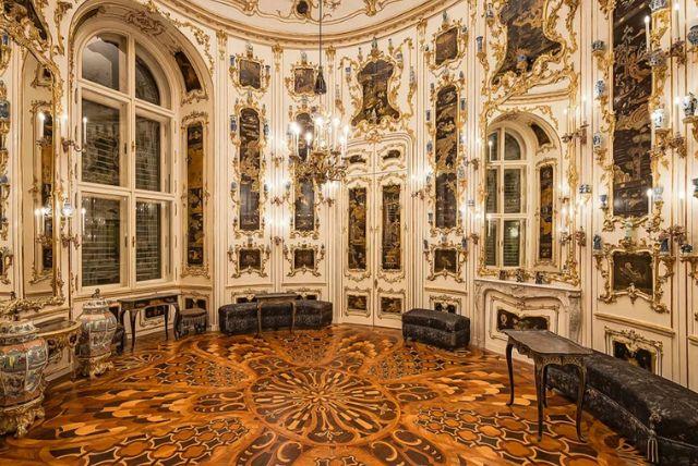 הקירות מעוטרים בעבודות דקורטיביות עדינות בצבעים בהירים, המשלבים זהב, לבן וגוונים רכים נוספים. שילוב הצבעים הזה היה נפוץ מאוד בארמונות אירופיים במאה ה-18 והוא נועד ליצור אווירה אלגנטית אך לא כבדה.